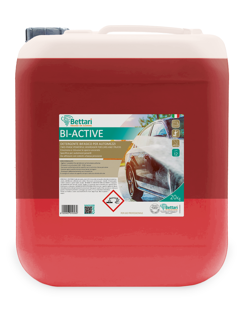 Biphasic detergent specific for removing fat and inorganic dirt from agricultural machinery, excavators, containers, tanks and heavy vehicles.